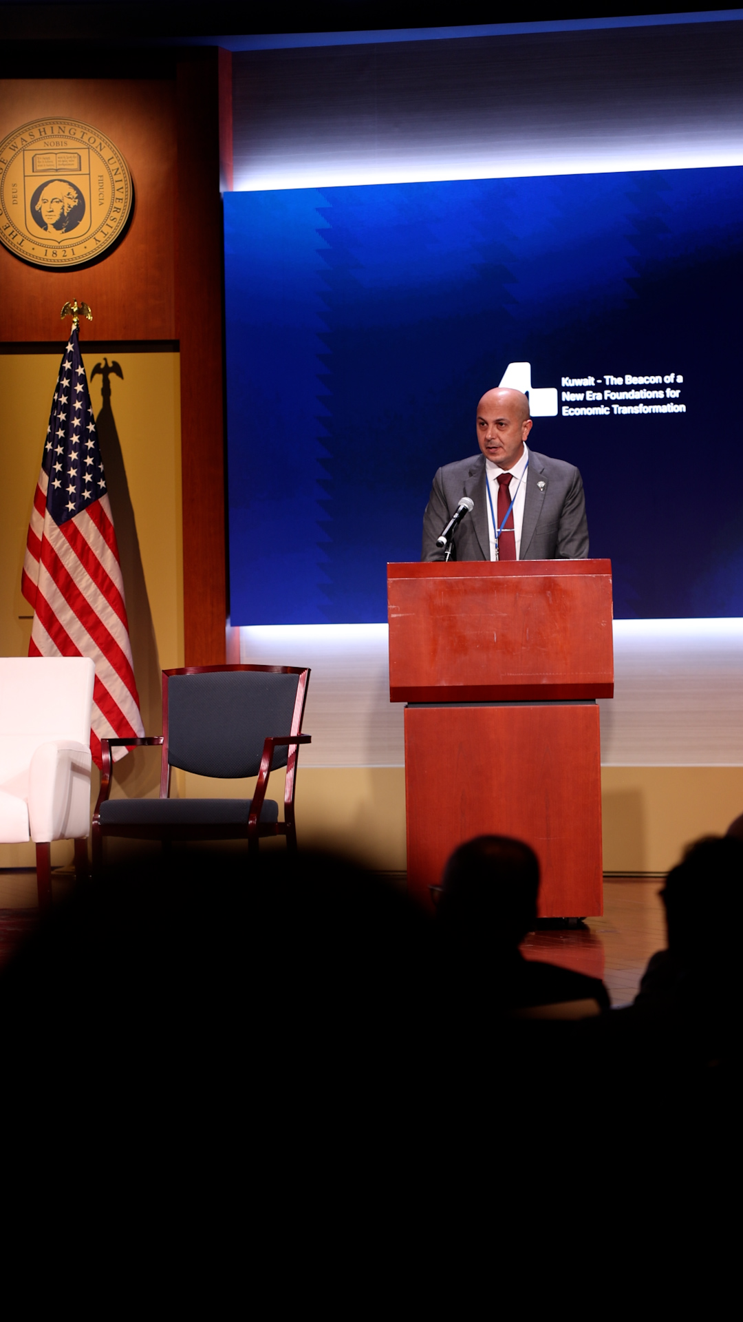 معالي وزير الكهرباء والماء والطاقة المتجددة ووزير المالية ووزير الدولة للشؤون الاقتصادية والاستثمار بالوكالة الدكتور/ صبيح عبدالعزيز المخيزيم يفتتح فعالية "التحول الاقتصادي في الكويت - أسس لمرحلة جديدة" في جامعة جورج واشنطن